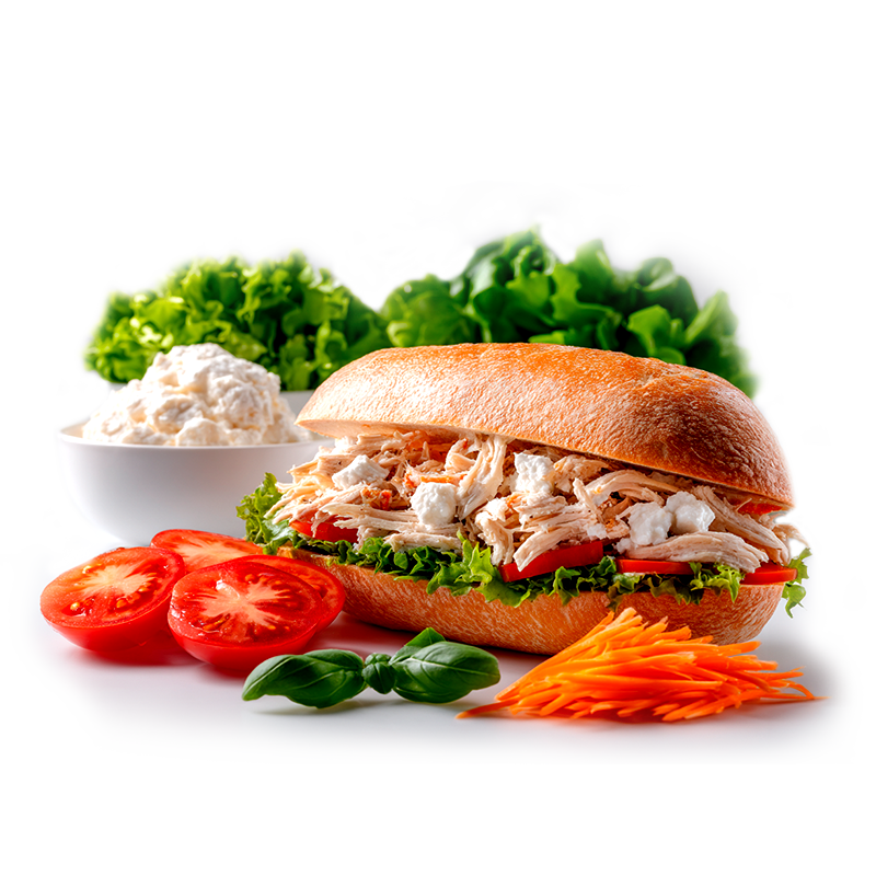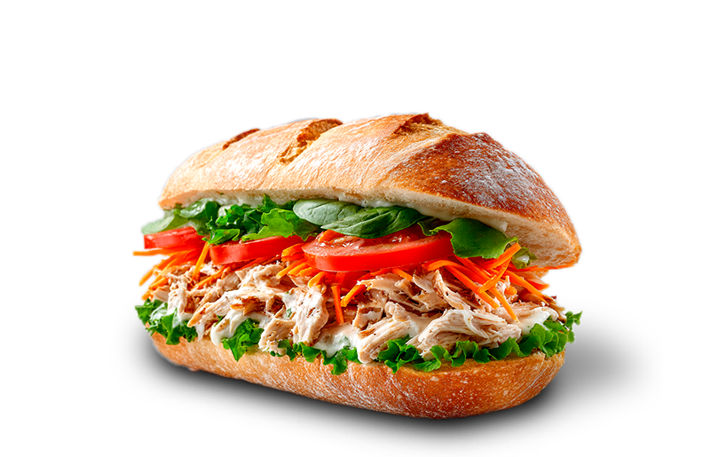 Frango desfiado temperado com requeijão cremoso, alface, tomate e cenoura juliette na baguete.